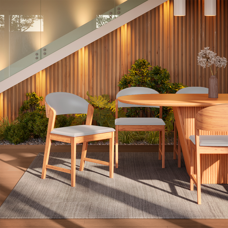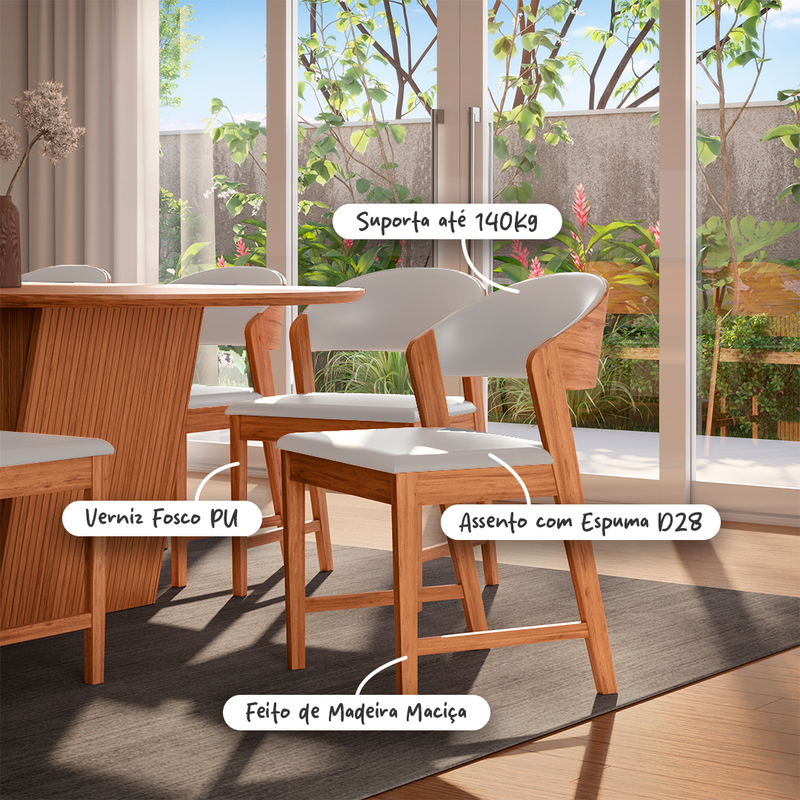 Com estrutura em madeira maciça e design leve, ela combina durabilidade e estética contemporânea. O encosto curvado proporciona apoio ergonômico e visual suave, criando uma experiência de uso confortável e acolhedora.