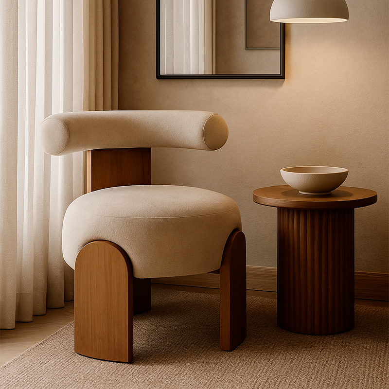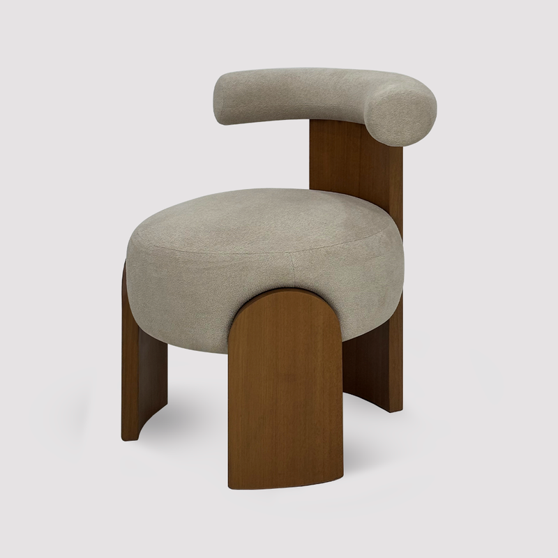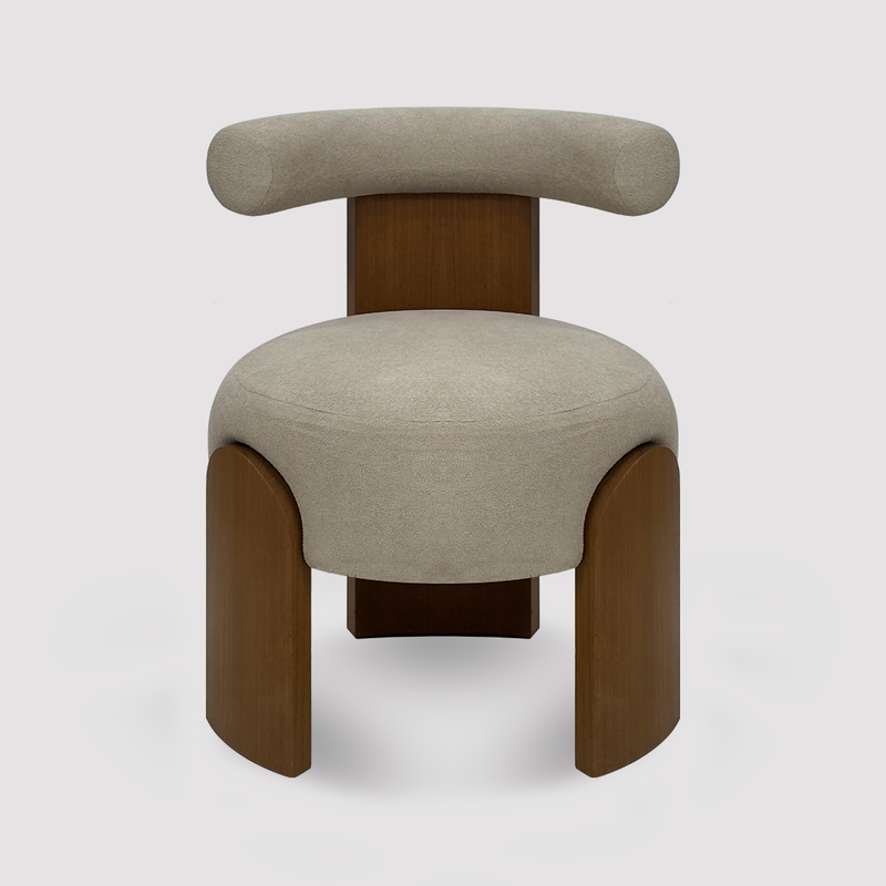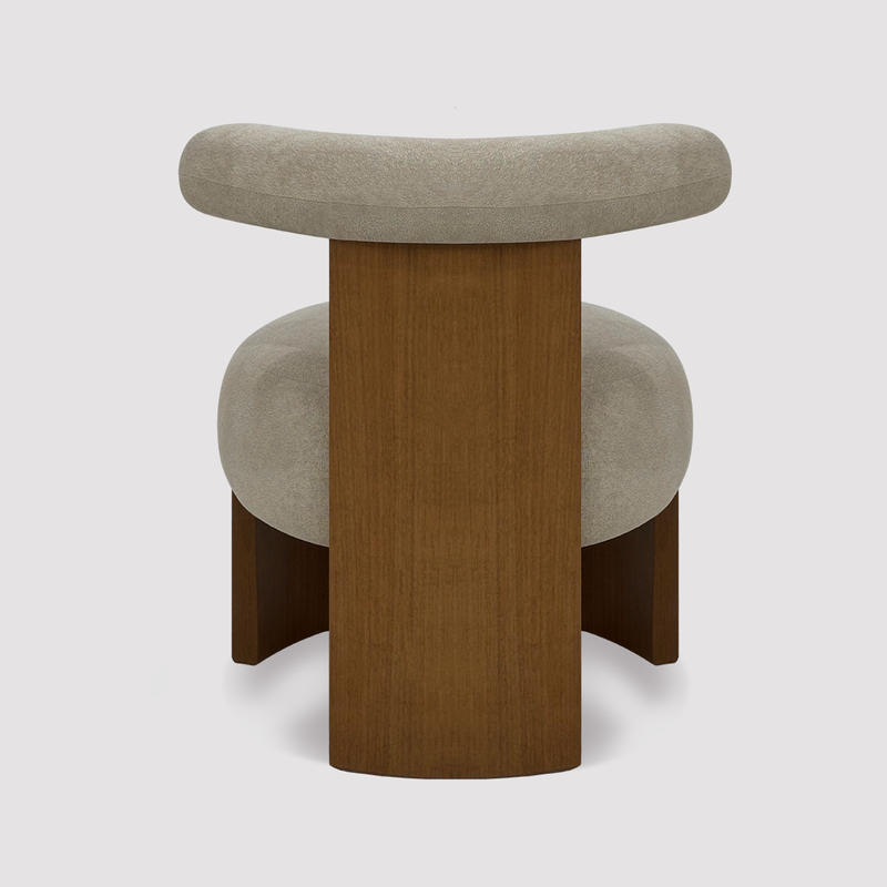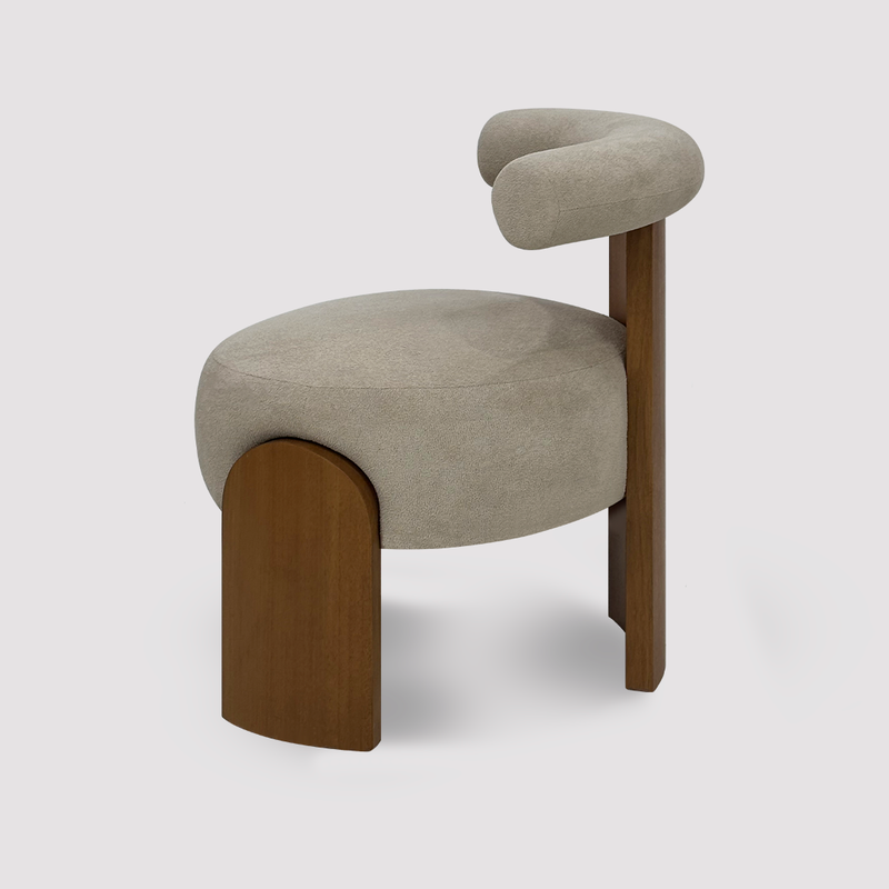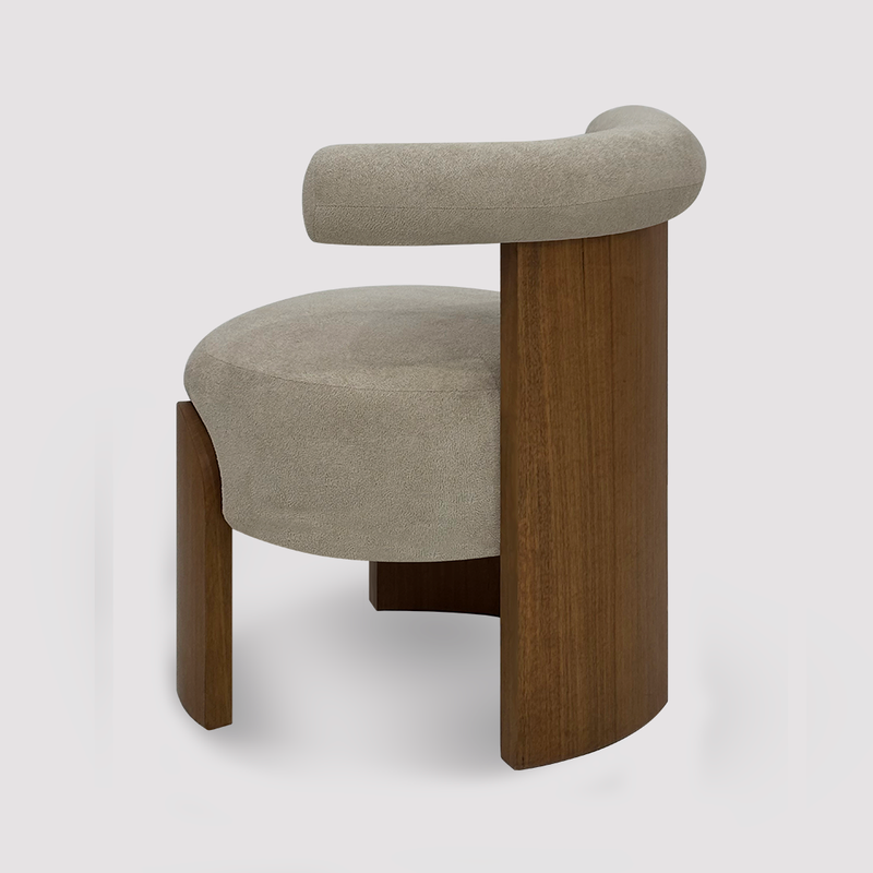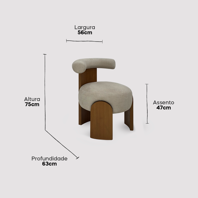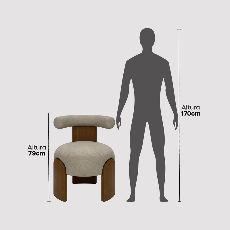 O assento redondo e o encosto envolvente garantem momentos de relaxamento profundo, seja na sala de estar, no canto de leitura ou no home office. As pernas largas e curvadas em madeira conferem estabilidade e um visual único, unindo a beleza da madeira à sensação de aconchego.
